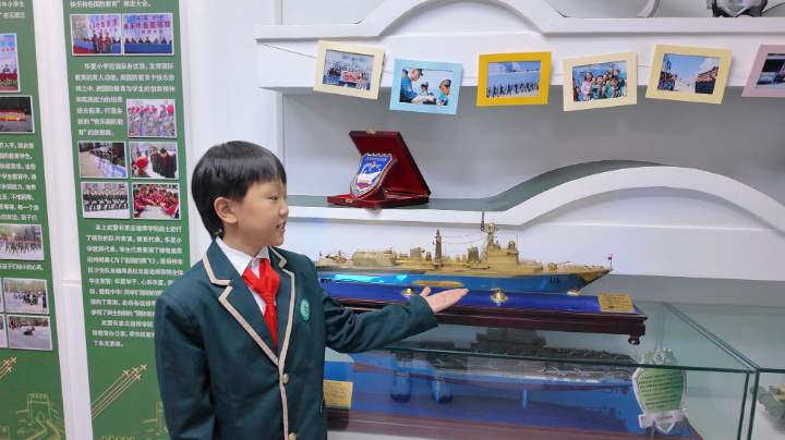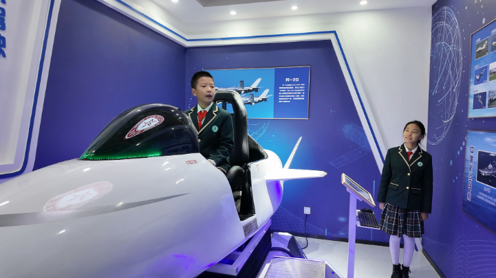 在学校的国防动员展馆国防成就展厅,陈列着歼-20、运-20等我国自主研制的主力装备模型,学生还可坐进VR战斗机模拟舱,亲身体验飞行的乐趣,在心中悄悄种下空天报国的种子。“这种翱翔在蓝天的感觉非常美妙,原来我就有当空军的梦,现在这种愿望更强烈了。”三年级学生蔡煜城说。