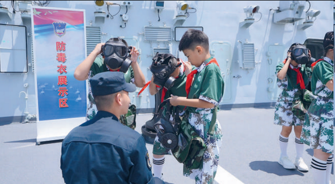 甲板上,舰艇旗语、船舶技艺、防护设备穿戴等充满舰艇特色的展示互动活动,吸引学生们踊跃参与。王泽毅穿上防火服,才发现穿着如此厚重的衣服,得用尽全身力气才能背起气瓶。他说:“海军哥哥帮我穿装备的时候,我摸到他手上的厚茧,才明白原来这些过硬本领,都是他们用汗水浇灌出来的。”