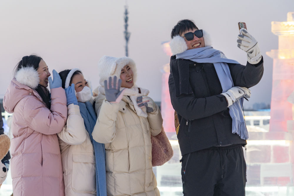 12月17日,游客在哈尔滨冰雪大世界园区拍照。新华社记者 张涛 摄