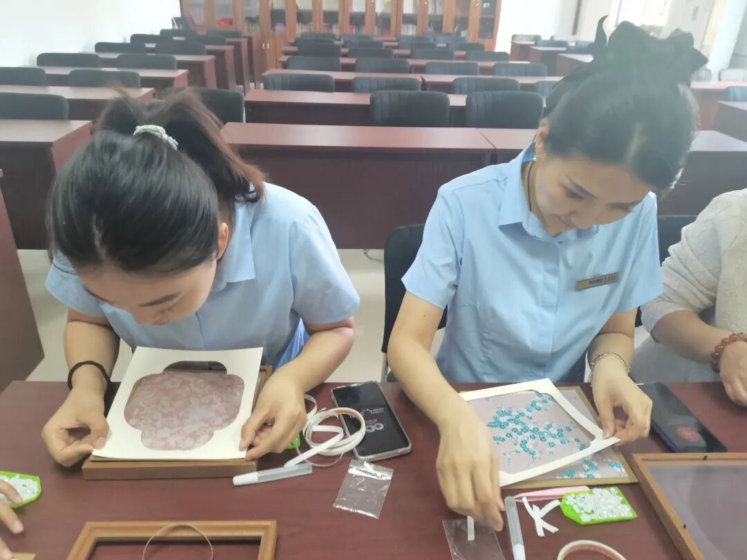 活动现场,社区居民在工作人员的指导下,亲手制作非遗宋锦珍珠画。大家手持工具,对照着宋锦经典纹样图谱细细琢磨珍珠的摆放位置,一副融合宋锦古韵与现代巧思的珍珠画渐次成型。工作人员现场还为大家讲解了苏州宋锦“锦上添花”的织造技艺,为大家揭开了宋锦“一寸宋锦一寸金”的神秘面纱。