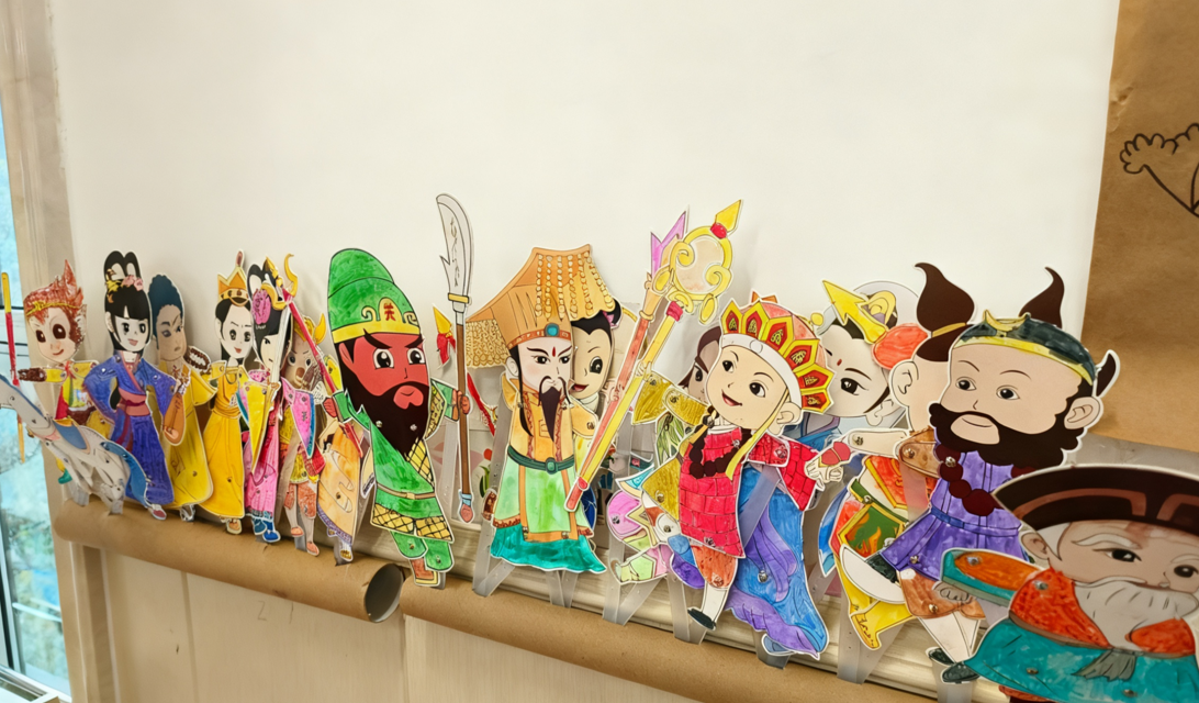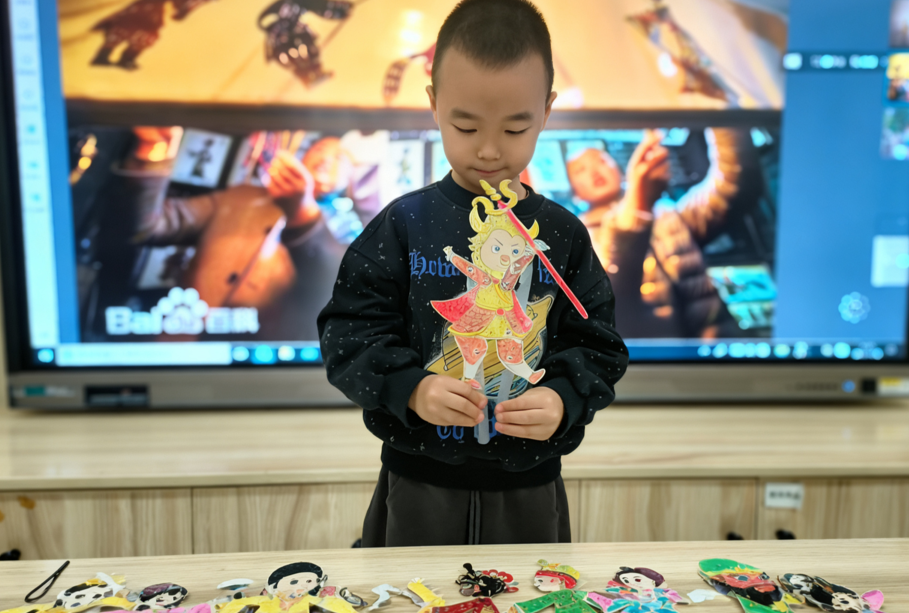 在老师的讲解下,孩子们化身为“小小非遗传承人”,通过制作、涂色、组成、粘贴等方式,将皮影小人儿制作得栩栩如生。