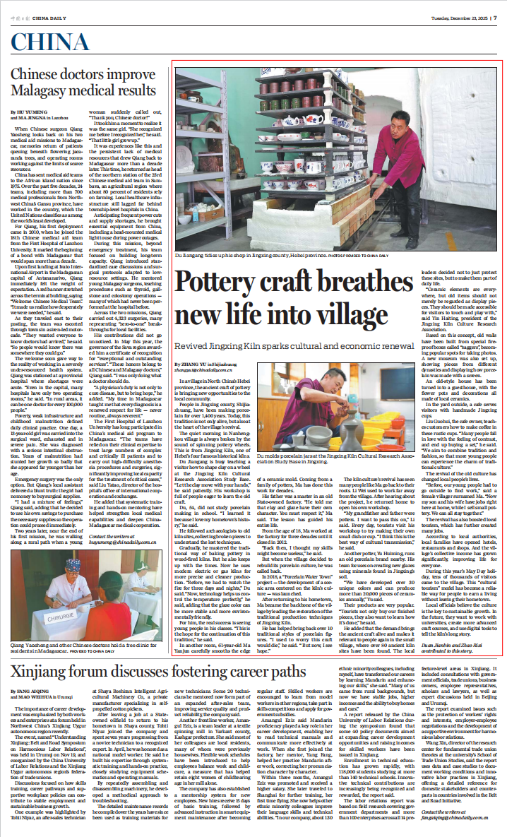 12月23日,《中国日报》刊发《Pottery craft breathes new life into village Revived Jingxing Kiln sparks cultural and economic renewal》(《河北陶艺赋能乡村新生 井陉窑复兴激活文旅发展》),对井陉县深挖千年井陉窑文化,打造陶瓷水镇,活化古窑遗址,创新陶艺体验、特色民宿、露营等 “陶瓷 +” 新业态,走出一条文化赋能乡村振兴特色之路的创新实践进行了报道。