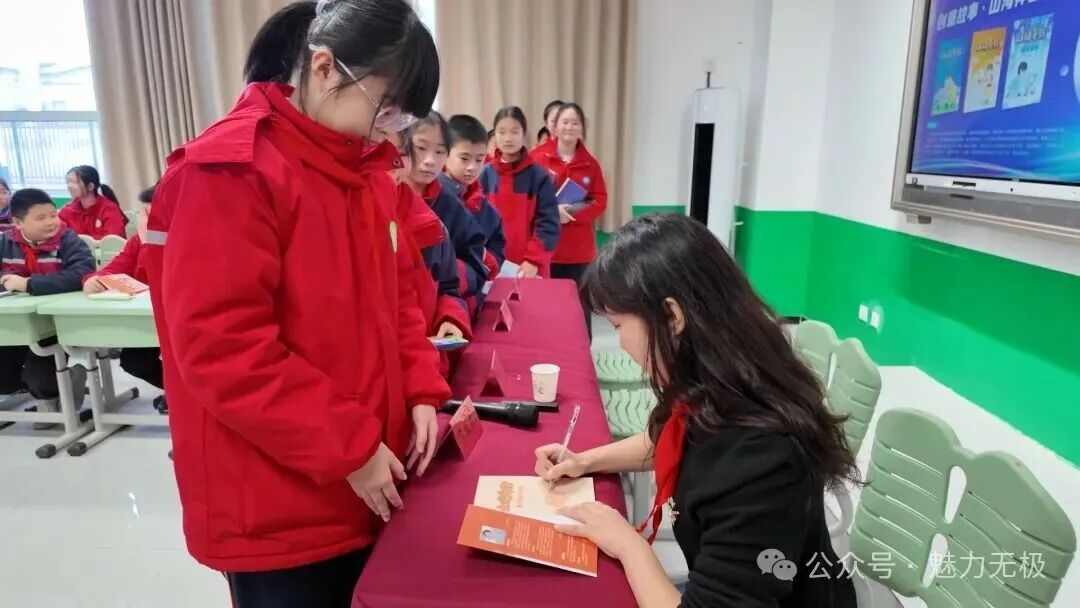 活动中,作家贺牧君立足传统文化传承和儿童文学创作,深入浅出地生动讲述了自己在文学作品创作中的灵感来源、写作思路和创作技巧,并和同学们面对面互动交流,热情回答孩子们的一个个提问。贺牧君还在同学们带来现场的自己的新书《山海奇缘》上签了名,并和大家合影留念。大家近距离接触到文学作家,更加激发了阅读和写作热情。