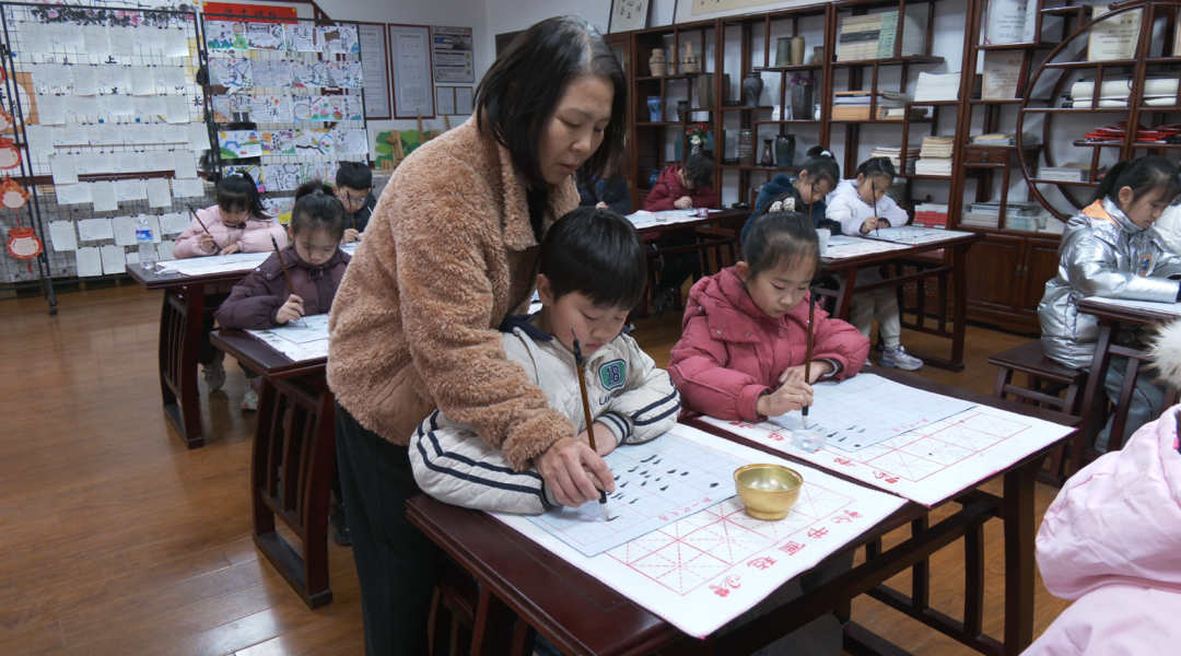规范汉字书写是传承中华优秀传统文化、提升学生核心素养的重要载体。逸夫小学始终重视书法教育,将其融入校园文化建设和日常教学体系,精心构建了涵盖硬笔、毛笔等多类型的书法课程。走进多功能书画教室里,学生们一幅幅书法作品整齐陈列,笔锋稚嫩却不失工整,或端庄秀丽,或刚劲有力。课堂上,老师手握毛笔凝神示范,笔尖在纸上流转自如,一笔一画讲解起笔、行笔、收笔的要领。遇到书写有困难的学生,便俯身细致点拨,纠正握笔姿势、调整运笔力度,用耐心与专业引导学生走进书法的世界。