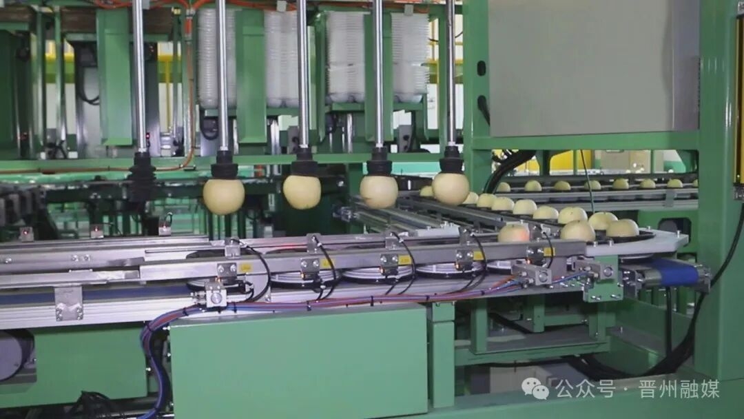 走进河北长城果品股份有限公司的生产车间,先进的智能化分拣设备正对鲜梨进行多维度检测分选。设备通过高精度传感器,能同时完成对梨果的重量、外观、糖度、内部病害检测四个维度的分级筛选,并实现鲜梨的自动贴标、装箱、码垛等工序,相关自动化数据统计、溯源信息等自动生成。分拣线旁,质检员正对梨果进行最后的品质检验,确保符合出口标准。包装区工人动作娴熟,将分好的梨果整齐装入专用包装盒中。