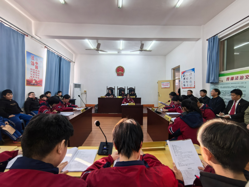 活动现场,学生开展模拟法庭实践活动。学生们分别扮演审判长、审判员、书记员、公诉人、原告、被告等角色,依照真实庭审流程,完整还原案件审理的各个环节,从开庭到法庭调查再到法庭辩论,每一个环节都演绎地有声有色,让在场师生沉浸式感受司法程序的严谨与庄重。庭审结束后,县人民法院法官对模拟法庭进行专业点评,既肯定了学生们的精彩表现,又针对庭审中学生们的细节问题进行详细讲解,同时也指出了法治教育基地法治教育室设施摆设及法官制服等不当问题,帮助学生深入理解法庭规则与法律精神,牢固树立法治意识。