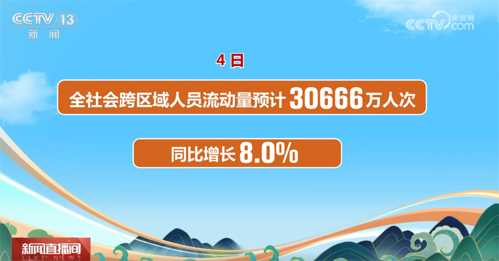 4日,全社会跨区域人员流动量预计30666万人次,同比增长8.0%。其中,铁路客运量预计1820万人次,同比增长3.7%。公路人员流动量预计28422万人次,同比增长8.3%。水路客运量预计190万人次,同比增长5.2%。民航客运量预计234万人次,同比增长5.1%。