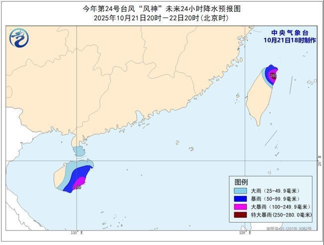 降水预报:21日20时至22日20时,海南岛、台湾岛北部、广东雷州半岛等地有大到暴雨,其中海南岛东部和南部局地有大暴雨(100—240毫米),台湾岛北部部分地区有大暴雨,局地特大暴雨(250—280毫米)。