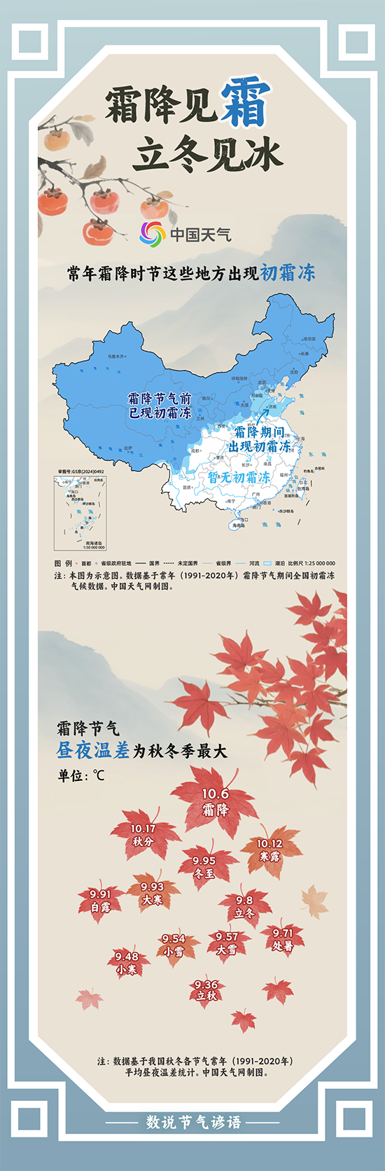 “霜降水返壑,风落木归山。”白居易这句诗生动勾勒出霜降时节的特征,霜凝雨歇、风吹叶落。常年此时,冷空气活动频繁,昼夜温差加大,寒意日渐深重,不少地方霜冻开始增多。民间有“霜降见霜,立冬见冰”的说法。