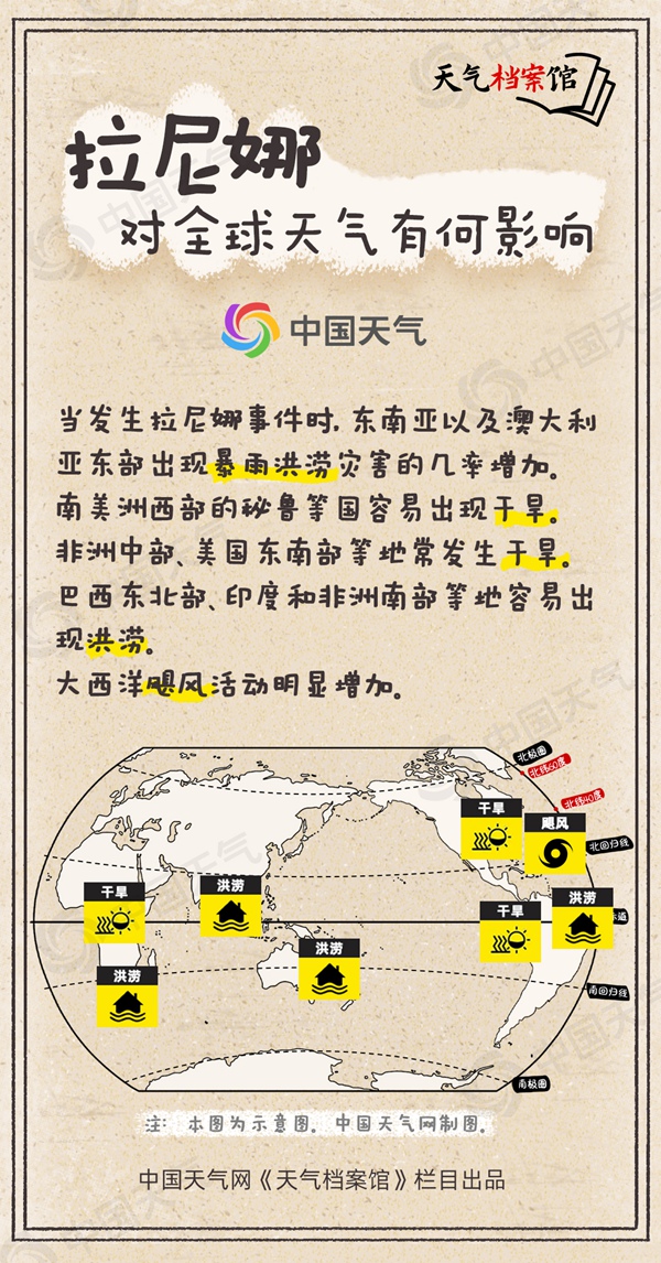 就这样,拉尼娜通过海洋影响了大气,并给热带太平洋及其附近地区带来干旱、暴雨等灾害性极端天气气候事件,甚至会间接影响到全球其他地区的天气气候并引发气候灾害,因此拉尼娜和厄尔尼诺一起被认定是气候系统年际气候变化中的最强信号。