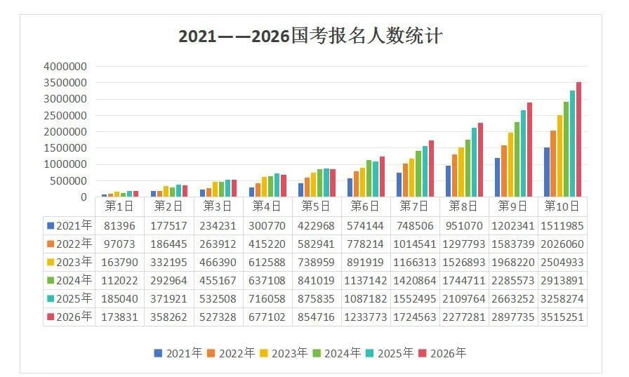 2026国考报名入口于10月24日18时正式关闭。根据中公教育统计,截至当日17时30分,2026国考报名总人数达3515251人,与上年同期相比增加近26万人,刷新历史新高,其中3207060人通过招录单位的审核,成功拿到2026国考的“入场券”,平均竞争比为92:1。由于本次数据统计并未完全在截止点,少量报名数据未统计在列,根据往年统计,在此报名人数基础上还有一定的增量。