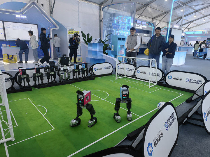 机器人在第八届世界声博会上进行足球比赛(11月3日摄)。新华社记者 汪海月 摄