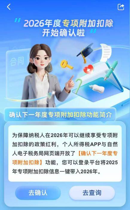 近日,国家税务总局开发的个人所得税APP首页上,已经上线2026年度专项附加扣除确认页面,老百姓在确认好明年自己适用的相关专项附加扣除信息后,就可以在明年1月起发工资后,尽早享受相关扣除,从而少缴个税,增加到手收入。