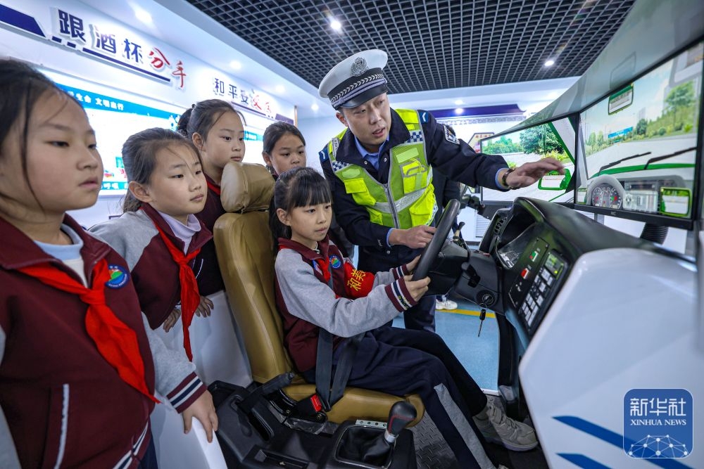 ↑ 12月1日,江苏省南通市通州区运盐河小学的学生在通州区交通安全教育基地体验VR交通模拟驾驶。新华社发(翟慧勇摄)