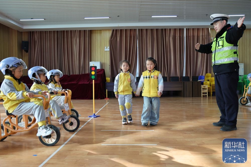 ↑ 12月1日,在山东省滨州市沾化区泊头镇中心幼儿园,孩子们在情景游戏中学习交通规则。新华社发(贾海宁摄)