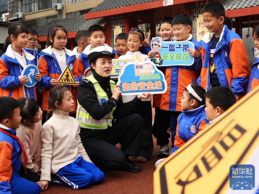 ↑ 12月1日,四川省达州市公安局交通警察支队直属一大队民警在通川区实验学校给小学生宣传交通法规。新华社发(邓良奎 摄)