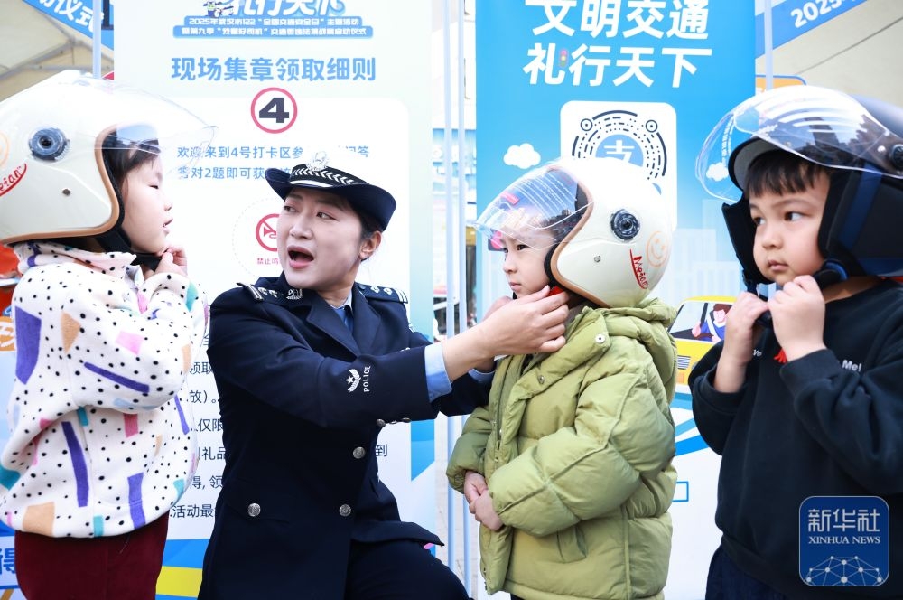 ↑ 11月30日,在武汉市江岸区塔子湖街道跃进社区,交警引导小朋友正确佩戴头盔。新华社发(赵军摄)