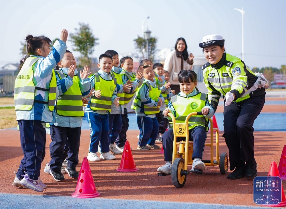 ↑ 12月1日,在江苏省兴化市施耐庵幼儿园,兴化市公安局交警和小朋友们进行交通安全情景模拟游戏互动。新华社发(周社根摄)