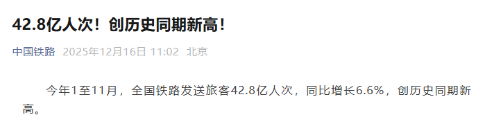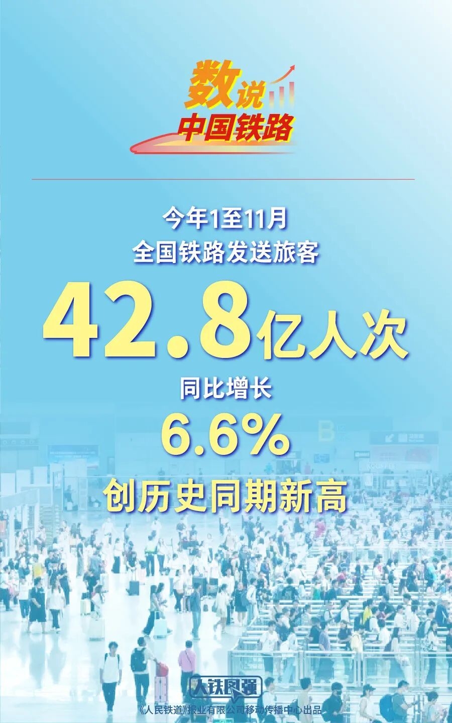 今年1至11月,全国铁路发送旅客42.8亿人次,同比增长6.6%,创历史同期新高。
