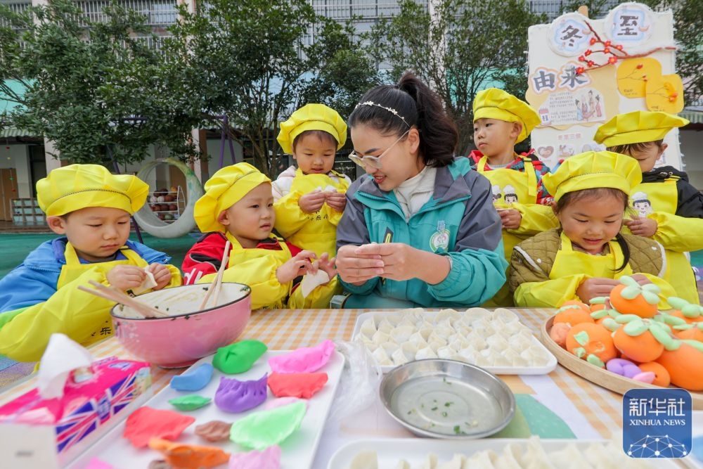 ↑ 12月18日,在贵州省开阳县紫兴街道东湖幼儿园,小朋友在老师的指导下学习包饺子。新华社发(袁福洪摄)
