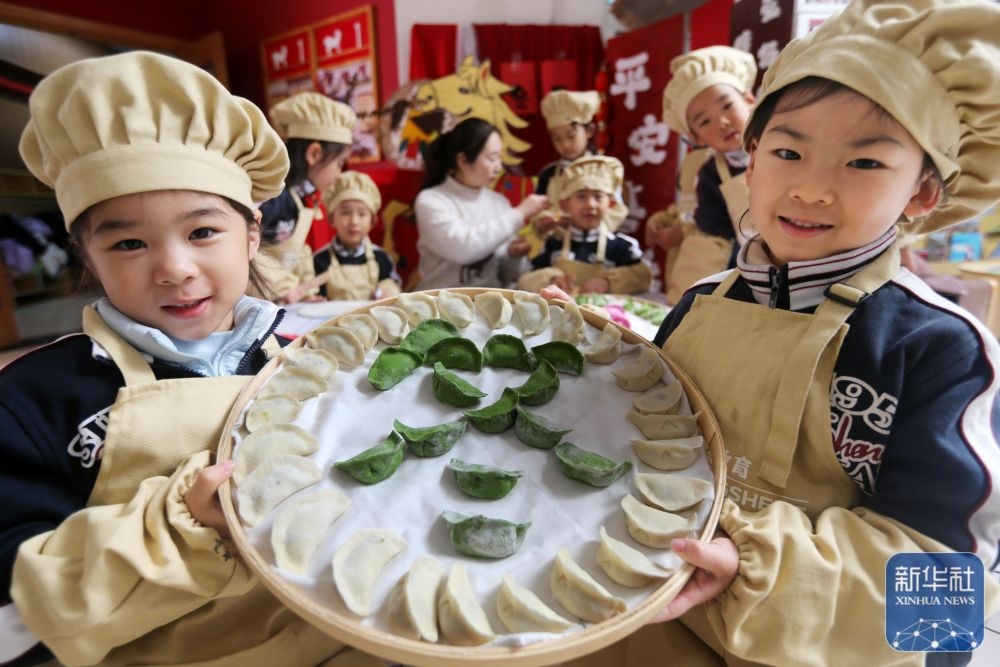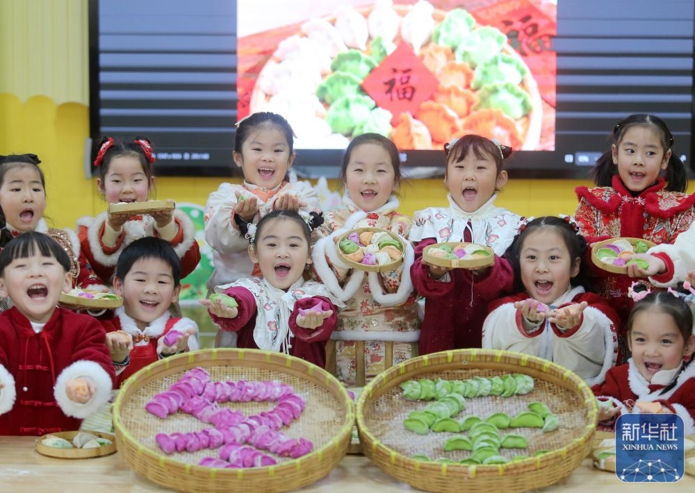 ↑ 12月18日,江苏省扬州市九龙花园社区一家幼儿园的小朋友展示包好的饺子。新华社发(孟德龙摄)