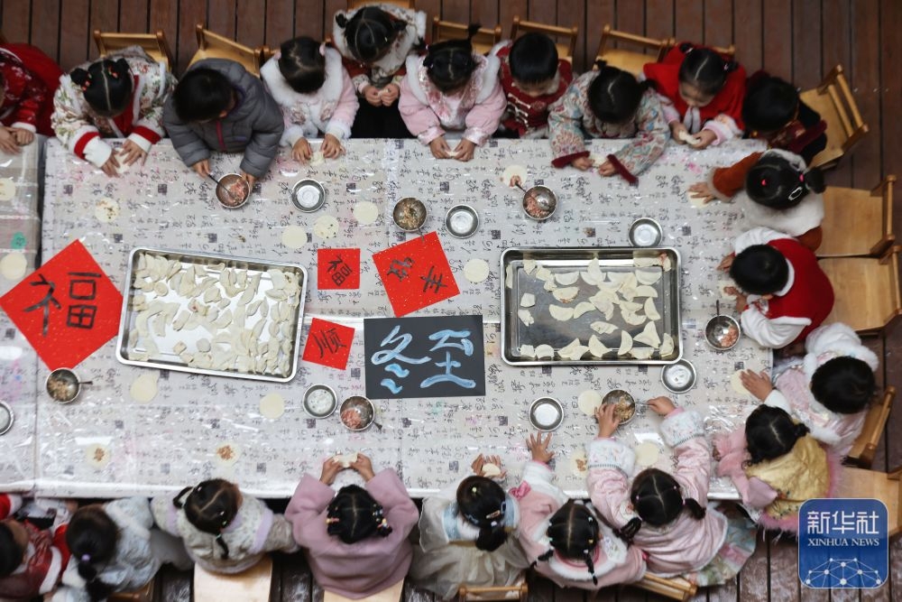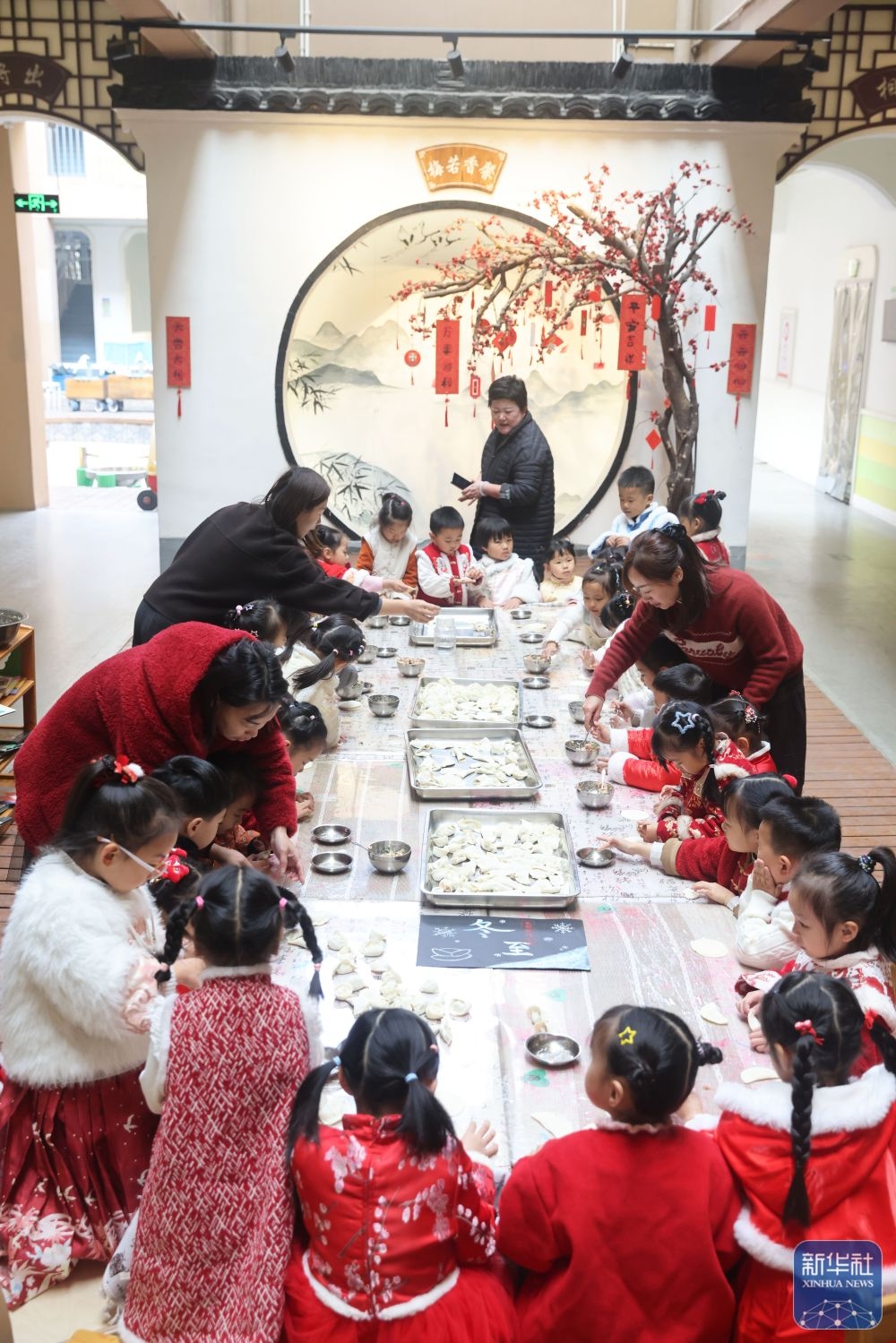 ↑ 12月18日,浙江省湖州市德清县乾元镇第一幼儿园小朋友在包饺子。新华社发(倪立芳摄)