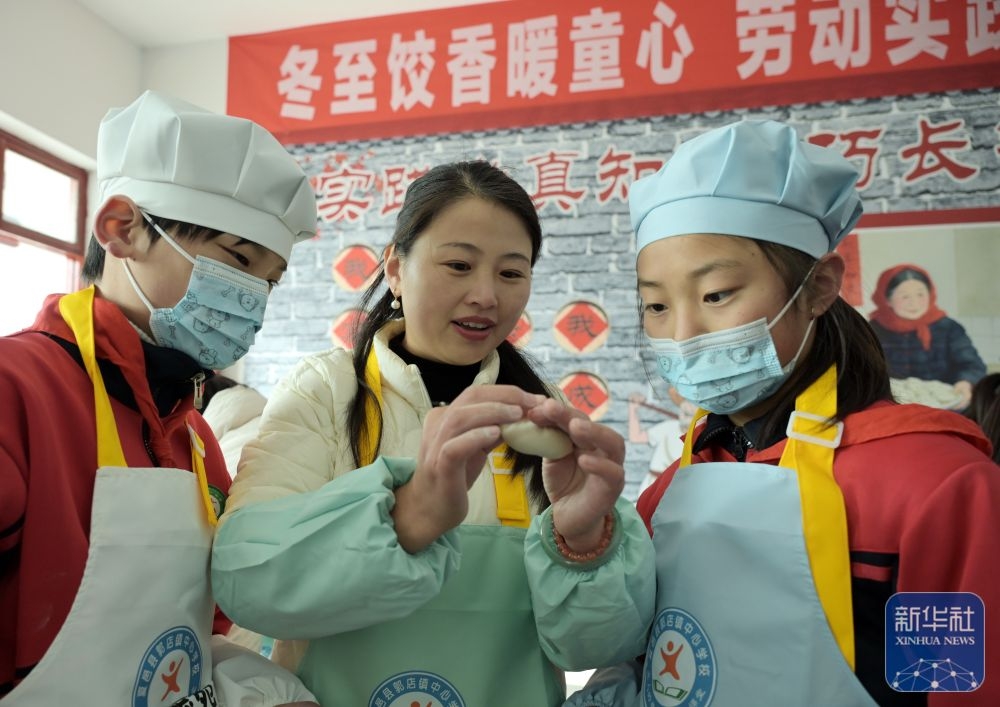 ↑ 12月18日,在河南省商丘市夏邑县郭店镇中小学教育实践基地“培根苑”烹饪室,老师给学生们示范包饺子。新华社发(苗育才摄)