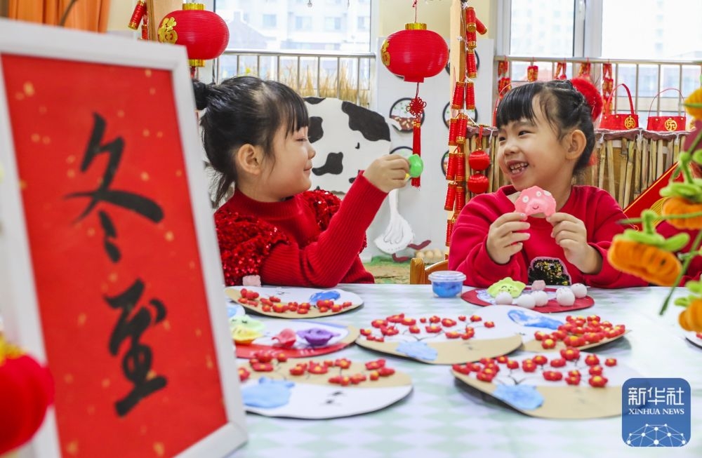 ↑ 12月18日,河北省唐山市海港经济开发区第二幼儿园的小朋友在包“饺子”。新华社发(刘满仓摄)