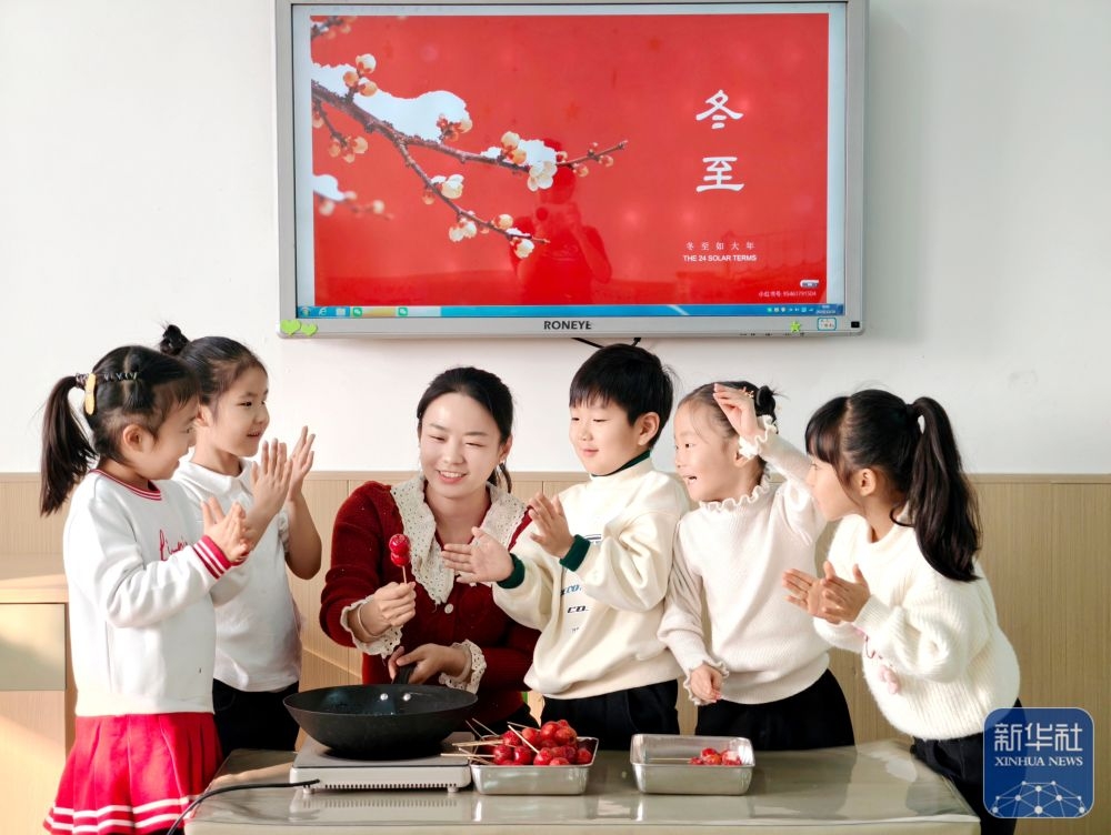 ↑ 12月18日,在河南省济源市第一幼儿园,老师和孩子们一起动手制作糖葫芦。新华社发(段二平摄)