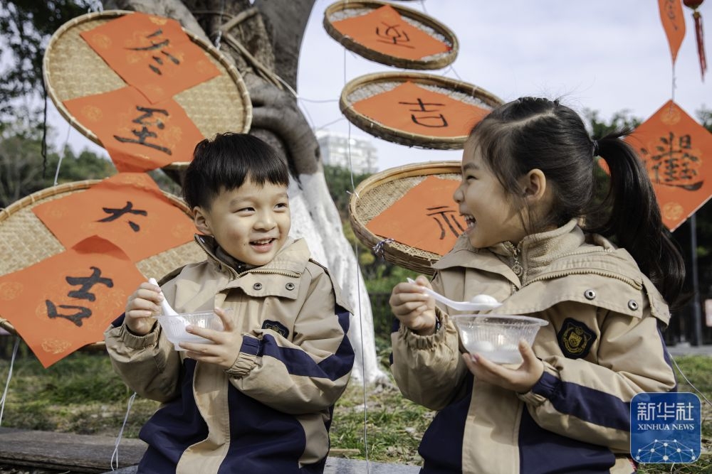 ↑ 12月18日,在浙江省温州市鹿城区万源社区举办的“足够精彩 暖聚冬至”主题活动现场,小朋友品尝汤圆迎接冬至。新华社发(刘吉利摄)