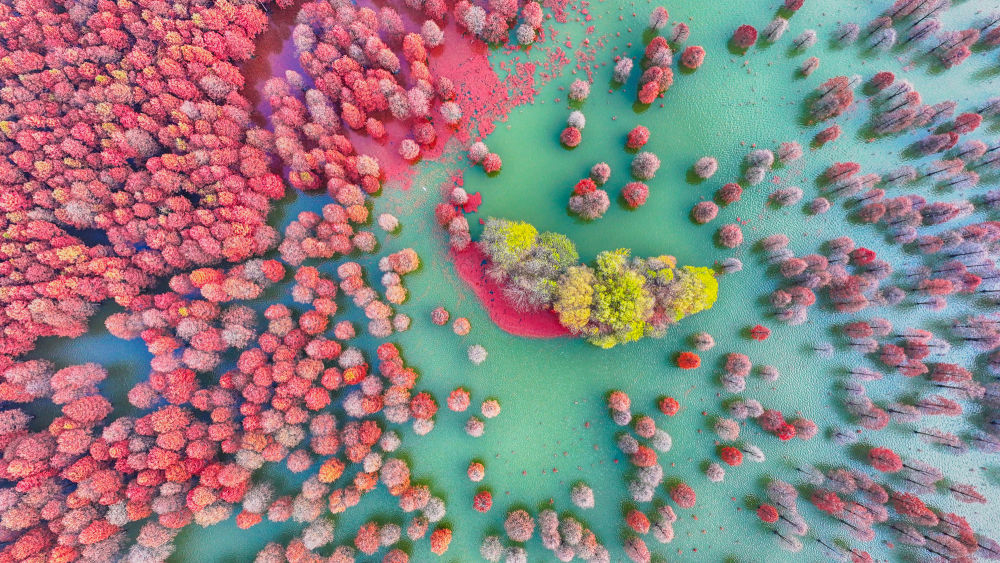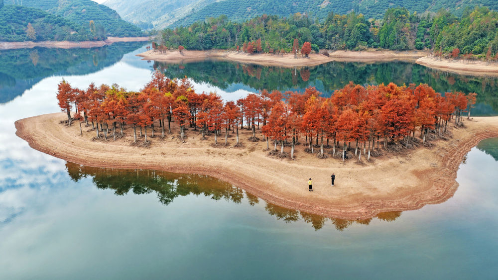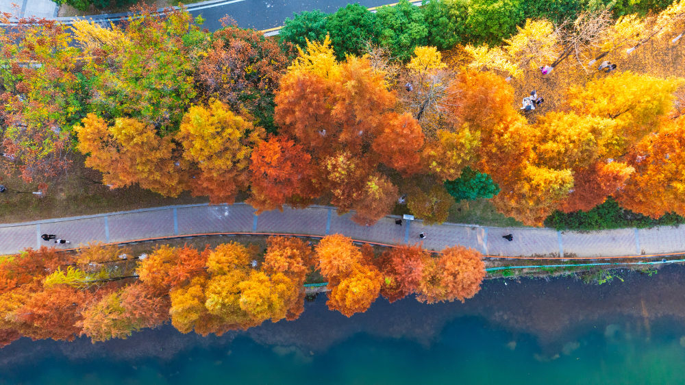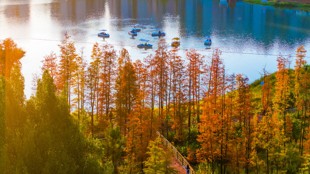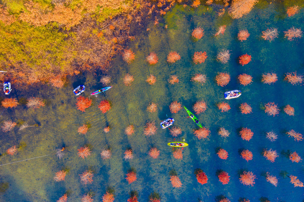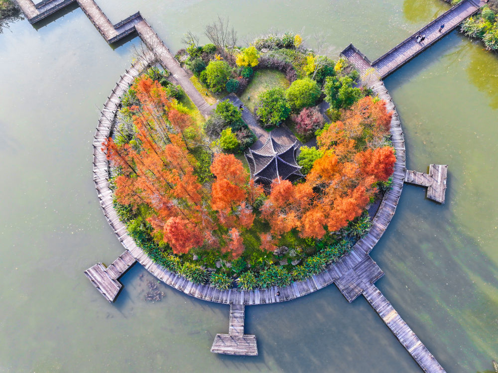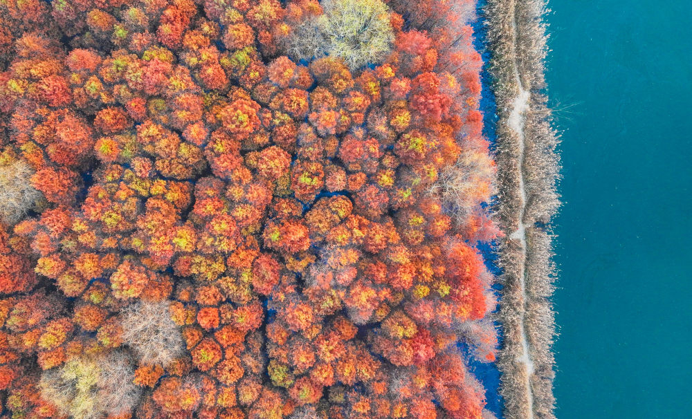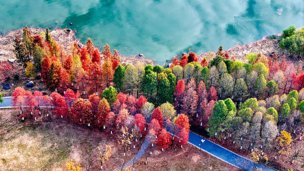 冬日时节,我国南方部分地区依旧呈现出绚丽的生态景观,色彩斑斓的林木和水生植物扮靓水岸,美景如画。