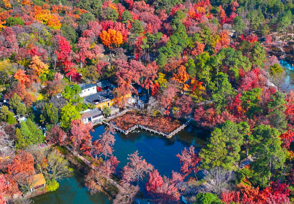 ↑2025年12月9日拍摄的江苏省苏州市天平山景区。(无人机照片)CICPHOTO/王建中 摄