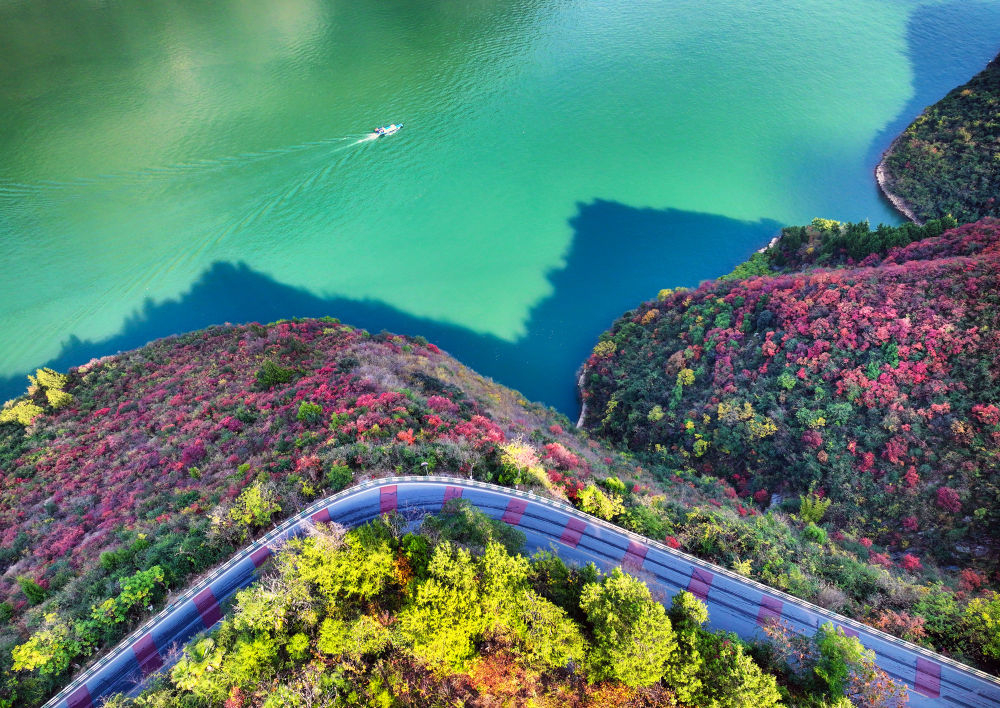 ↑2025年12月19日,重庆巫峡两岸层林尽染,游船在江面悠然行驶,构成一幅美丽的生态画卷。(无人机照片)CICPHOTO/张远明 摄