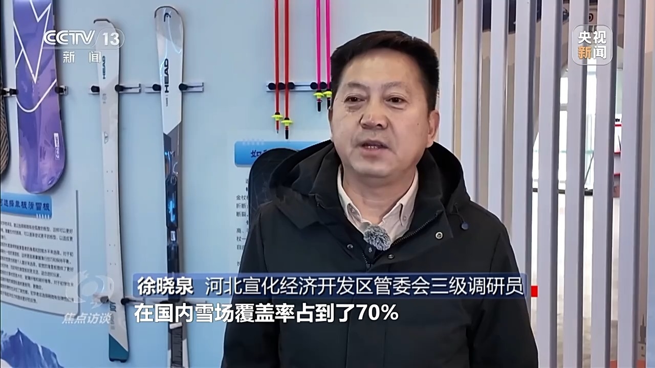 河北宣化经济开发区管委会三级调研员 徐晓泉:目前,入驻园区的8家企业,雪场装备和个人装备均是国产品牌。其中,个人单板滑雪装备在国内雪场覆盖率占到了70%,仿真冰产品占到了国内的50%。