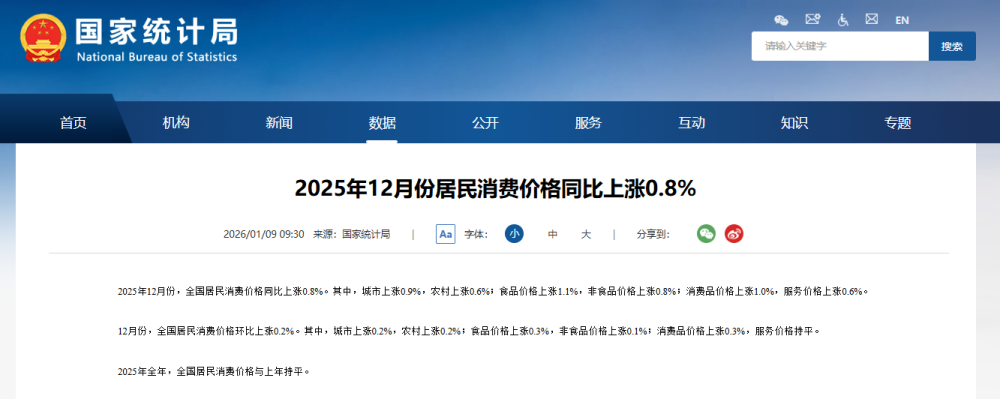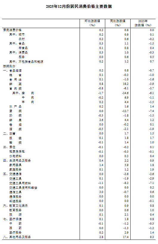 2025年12月份,全国居民消费价格同比上涨0.8%。其中,城市上涨0.9%,农村上涨0.6%;食品价格上涨1.1%,非食品价格上涨0.8%;消费品价格上涨1.0%,服务价格上涨0.6%。
