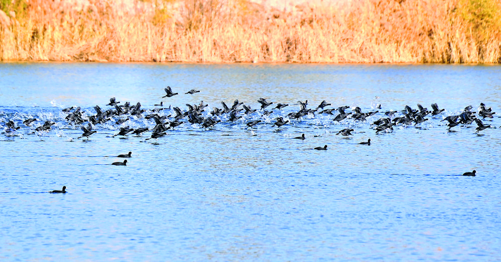 冬日里,石家庄滹沱河生态区成为鸟的乐园。苍鹭、青头潜鸭、斑嘴鸭等野生鸟类在碧水蓝天间或觅食休憩,或嬉戏飞翔,为滹沱河生态区增添了勃勃生机。(来源:石家庄日报 记者 张 震 摄)