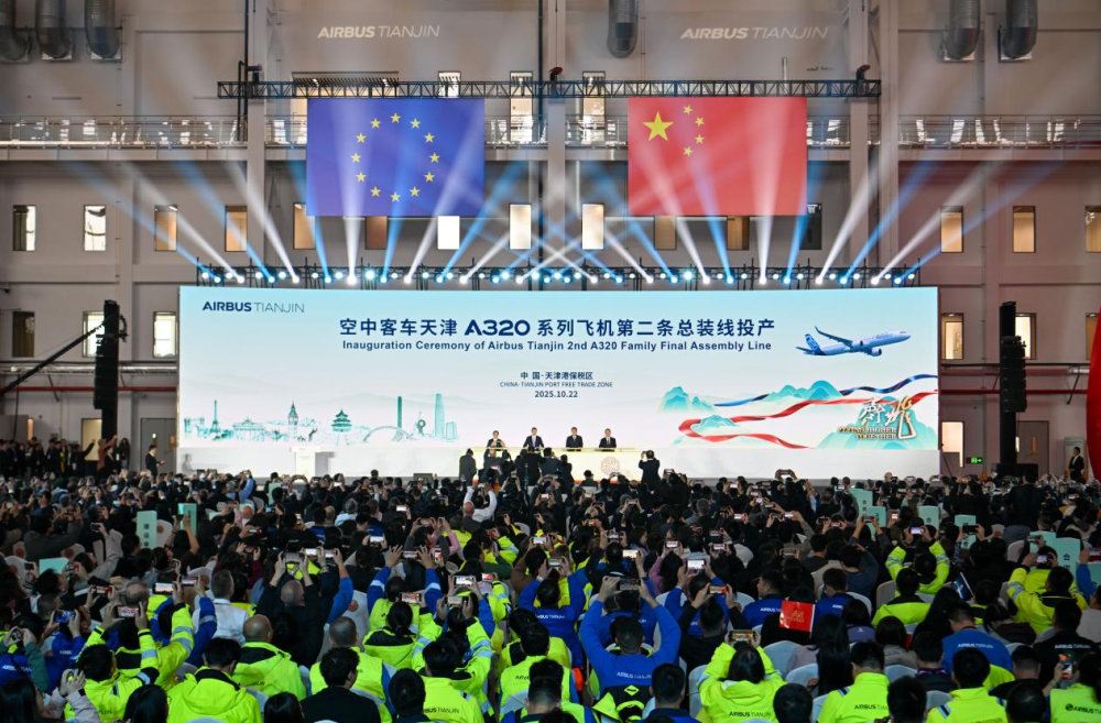 2025年10月22日拍摄的空客天津A320系列飞机第二条总装线投产仪式现场。 新华社记者 孙凡越 摄