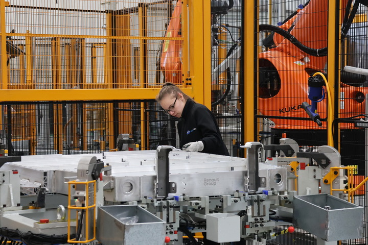 2024年2月24日,在法国吕茨,中国敏实集团与法国雷诺集团成立的合资公司的员工在电池盒产线上工作。 新华社记者 张百慧 摄