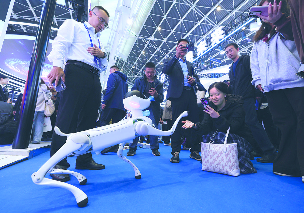 ▲10月17日,参观者在博览会上与机器狗互动。记者 梁子栋 摄
