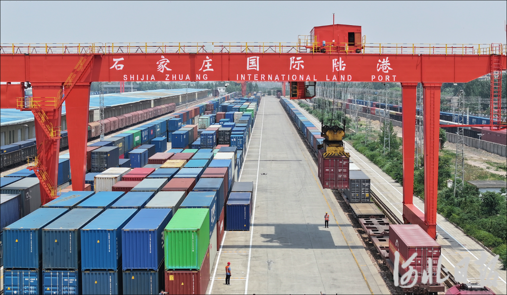 6月11日,石家庄国际陆港内的龙门吊将货物装上列车。河北日报记者史晟全摄