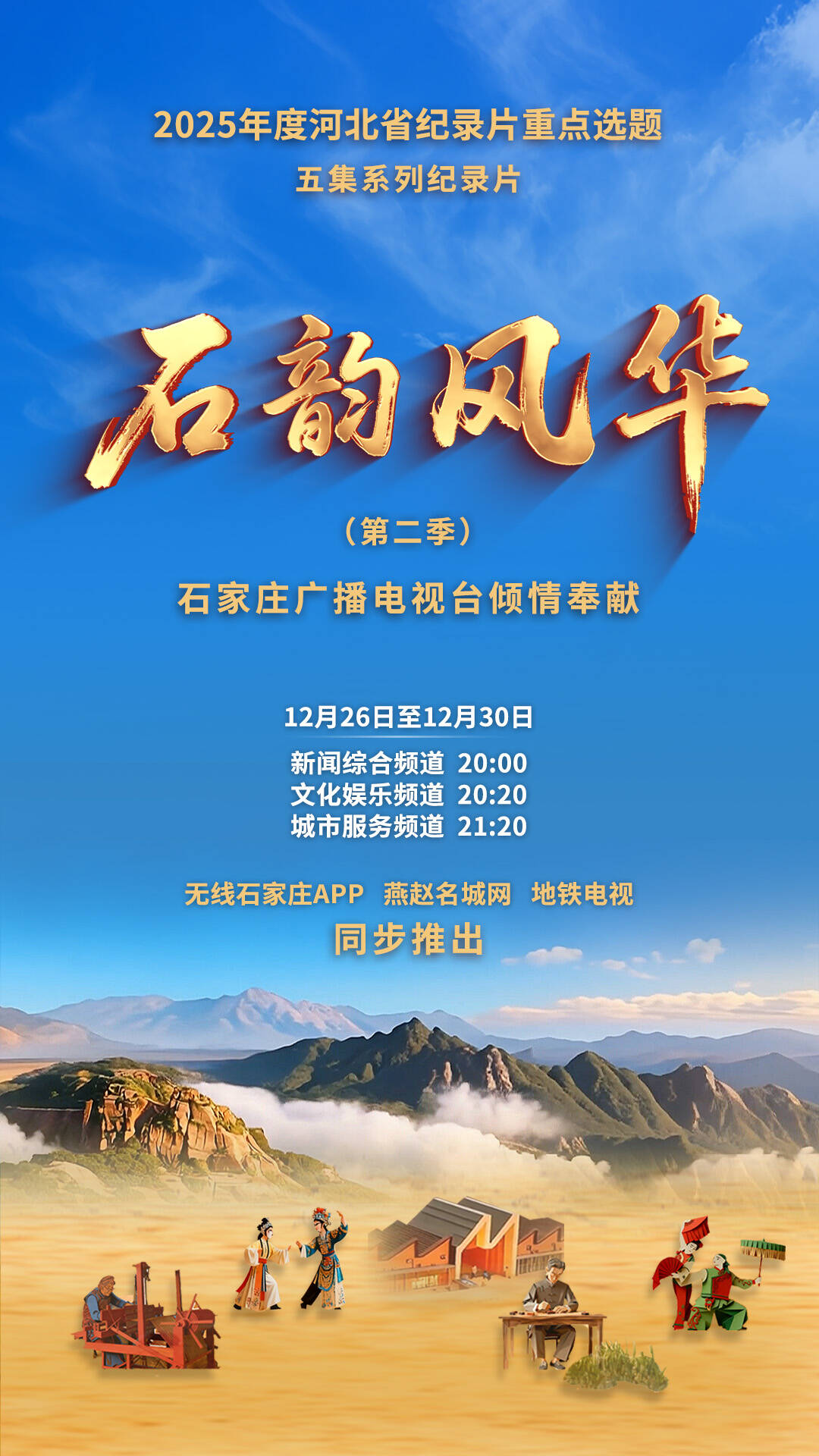 2025年12月26日至12月30日,《石韵风华》(第二季)将在石家庄广播电视台新闻综合频道(20:00)、文化娱乐频道(20:20)、城市服务频道(21:20)以及无线石家庄APP、燕赵名城网、地铁电视全媒体同步推出,敬请关注。