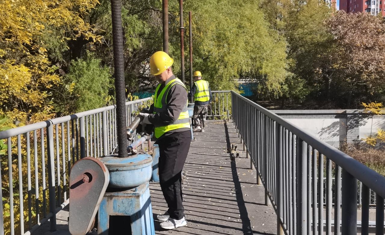 设施安全是河道管理的重中之重。记者从该中心获悉,目前已完成今年第二轮闸门、橡胶坝及钢坝的高标准维保工作,设施设备完好率显著提升。在中山路两侧,管护工人正对护栏进行清洁、裂缝补强和基础维修工作,今年以来,他们已修复护栏长度约500米,有效消除了安全隐患。此外,为确保冬季补水系统稳定运行,中心已对相关泵站所有水泵进行了彻底的拆解清洗、除锈和防腐处理。