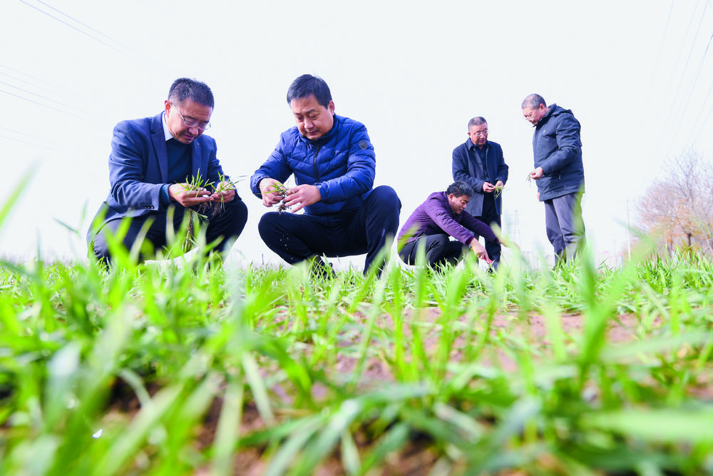 图为石家庄市农林科学研究院专家与晋州市农技人员一起查看晚播小麦生长情况。记者 张晓峰 摄