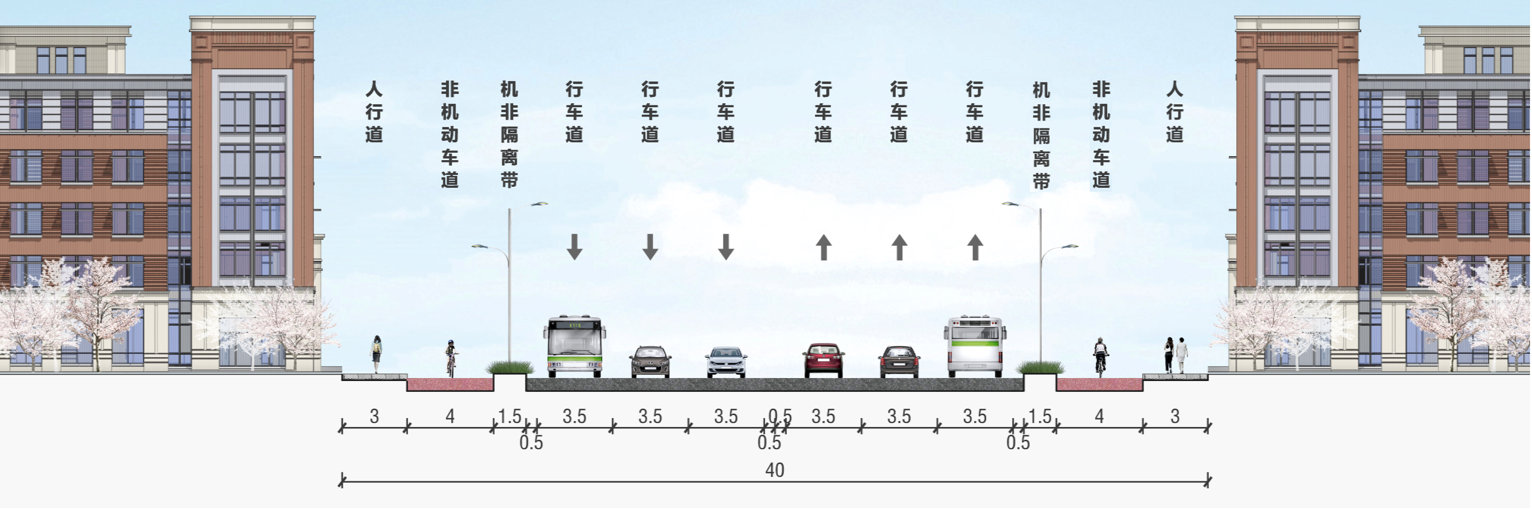 全长约700米,红线宽度40米,采用城市主干路标准,双向六车道,设计速度50公里/小时。建设内容包含道路、管线、交通设施、照明、绿化等。