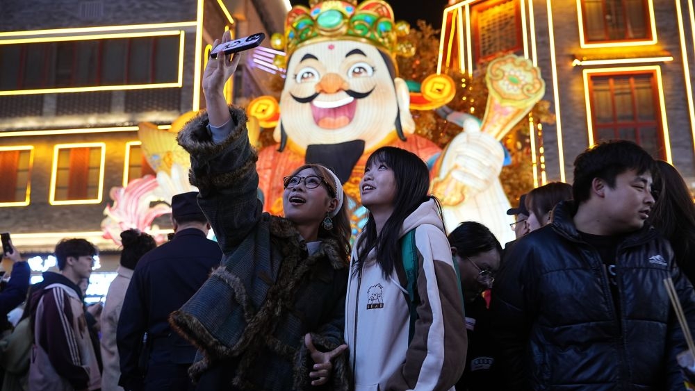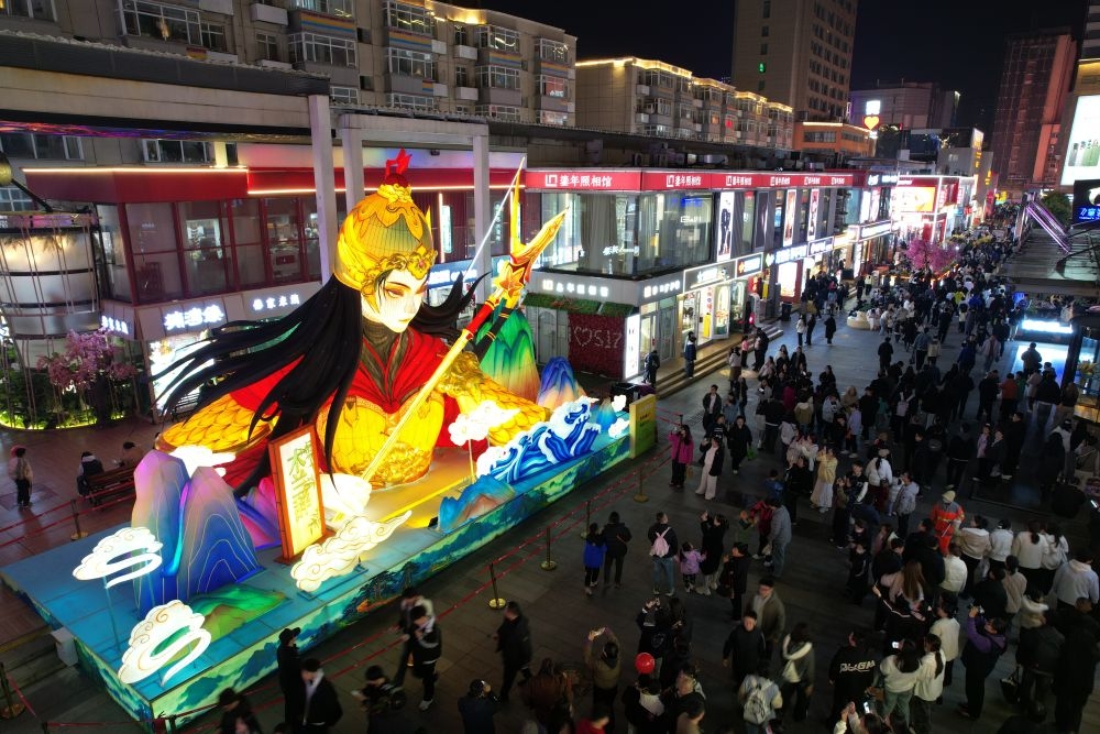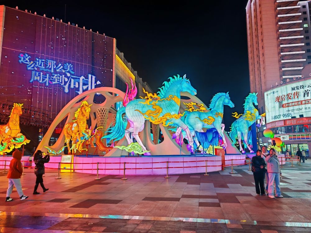 ↑11月17日,市民在石家庄市新华区湾里庙步行街“天马行云”花灯前打卡留念。(付杉 摄)