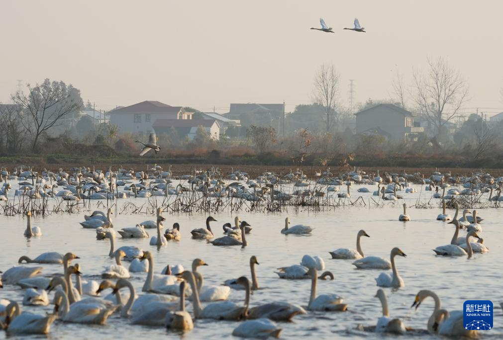 12月15日在湖南省岳阳市汨罗市屈原管理区东古湖湿地拍摄的小天鹅。