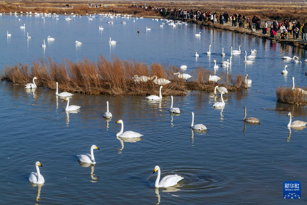 12月14日,游客在山西省运城市盐湖湿地观赏越冬天鹅。