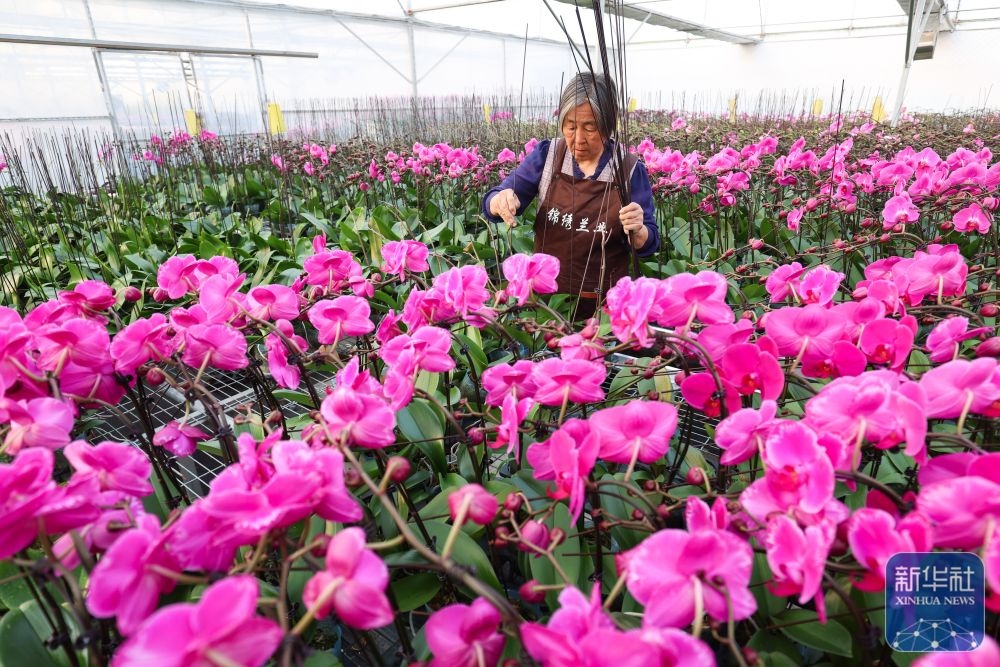↑ 12月17日,工作人员在河北省石家庄市藁城区廉州镇一家花卉种植基地养护蝴蝶兰花卉。新华社发(梁子栋摄)