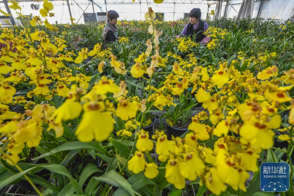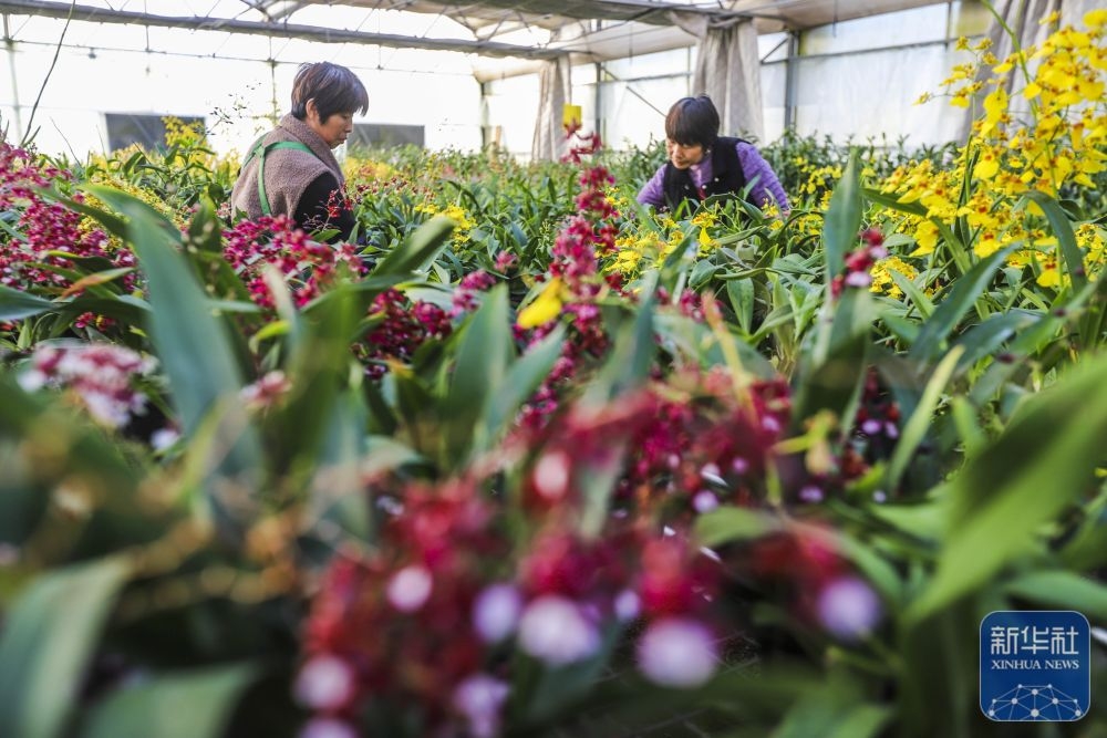↑ 12月17日,工作人员在河北省迁西县罗家屯镇一家花卉种植基地的花卉种植车间工作。新华社发(刘满仓摄)