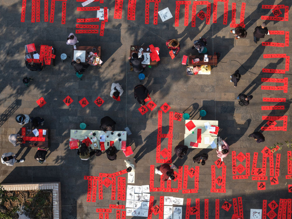 ↑ 12月29日,四川省攀枝花市文学艺术界联合会组织书法爱好者在米易县丙谷镇为当地居民写春联(无人机照片)。新华社发(李向雨摄)